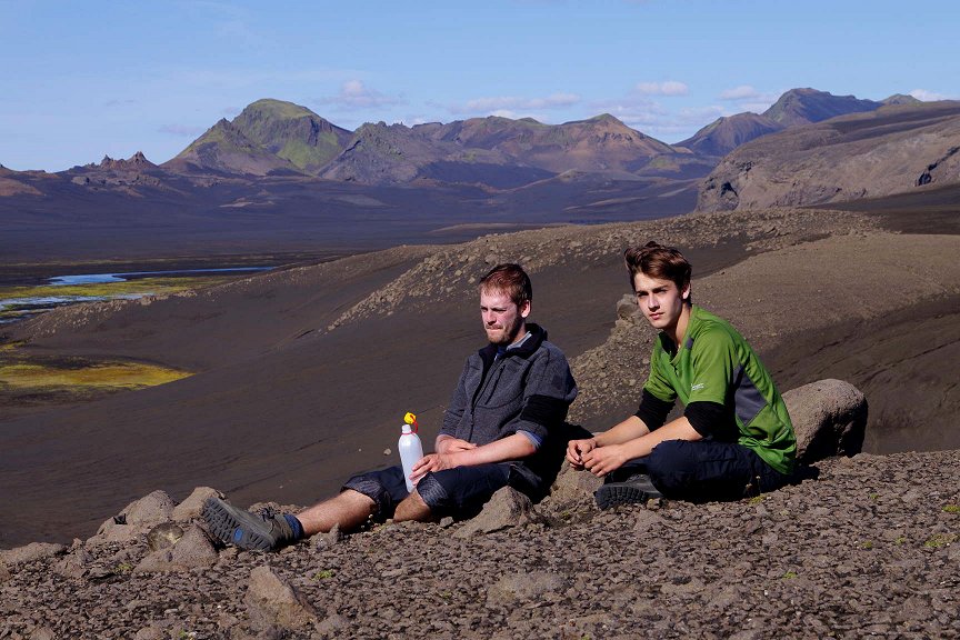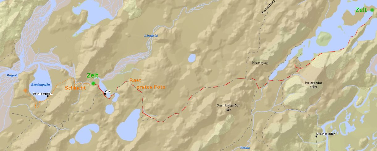 Zum Botnlangalón sind es nur ca. 3 km. Da reizte am 9. Tag ein Ausflug zu den halbinselartig ins Tal der Tungnaá hingestreckten Hügeln westlich vom Botnlangalón. Man wird mit der Aussicht auf eine atemberaubende Flusslandschaft belohnt. |